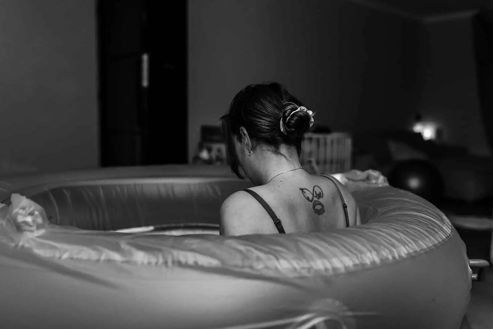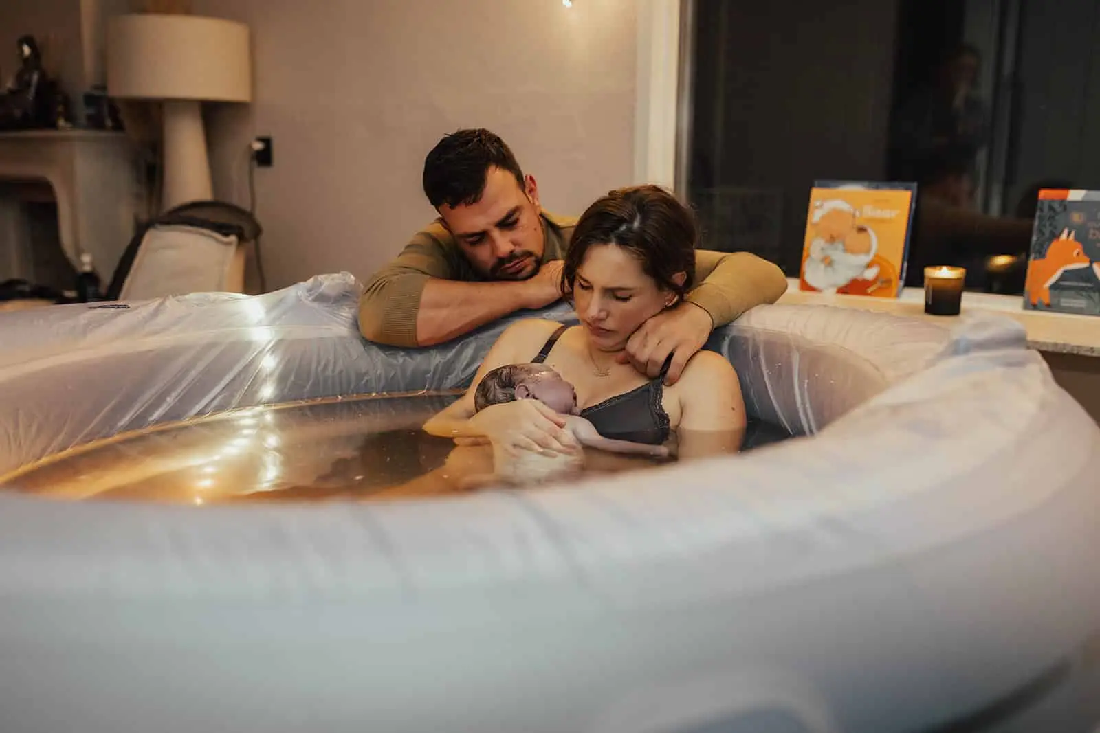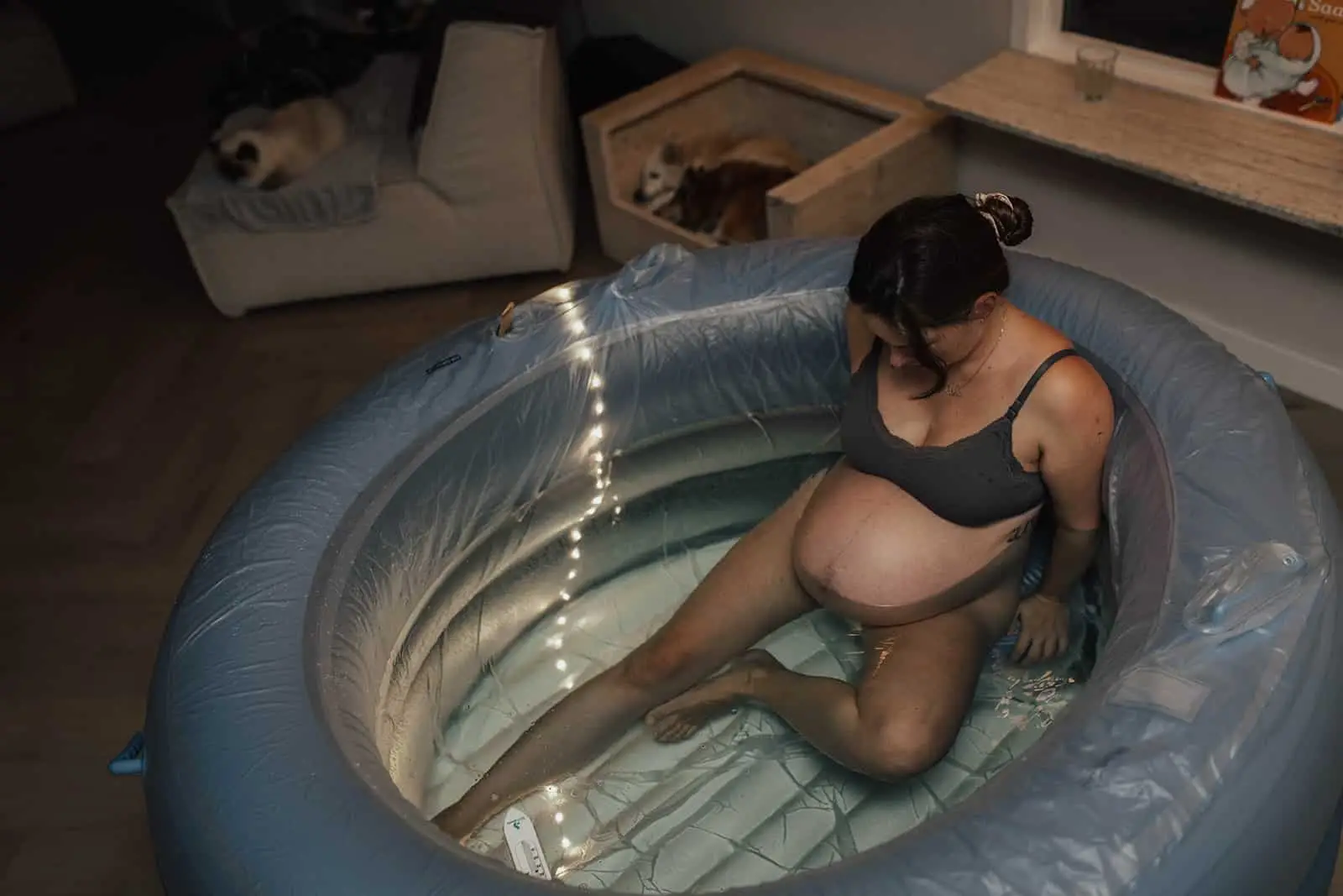 Toen de rust wederkeerde en ik even ruimte kreeg om alles in me op te nemen zag ik pas hoe gezellig en fijn de woonkamer was. Überhaupt het hele huis, prachtig! Op zo’n mooie rustige locatie met een enorme tuin en vrij uitzicht, ik begreep direct waarom ze hierheen verhuisd waren. De woonkamer was versierd met een slinger met daarop “hello baby”, er stond een heerlijke geurkaars naast het bad en fijne rustige muziek op. De lichten waren gedimd en er hing een lichtsnoer om het raam. Echt een ontzettend ontspannen en relaxte vibe heerste er en dat was ook alles wat deze geboorte was. De verloskundige, oma en ik zaten aan de eettafel en lieten Nayla (en Mark) even hun ding doen, weer in de bubbel komen en samen zijn. Af en toe keek ik om het hoekje en maakte ik een foto.