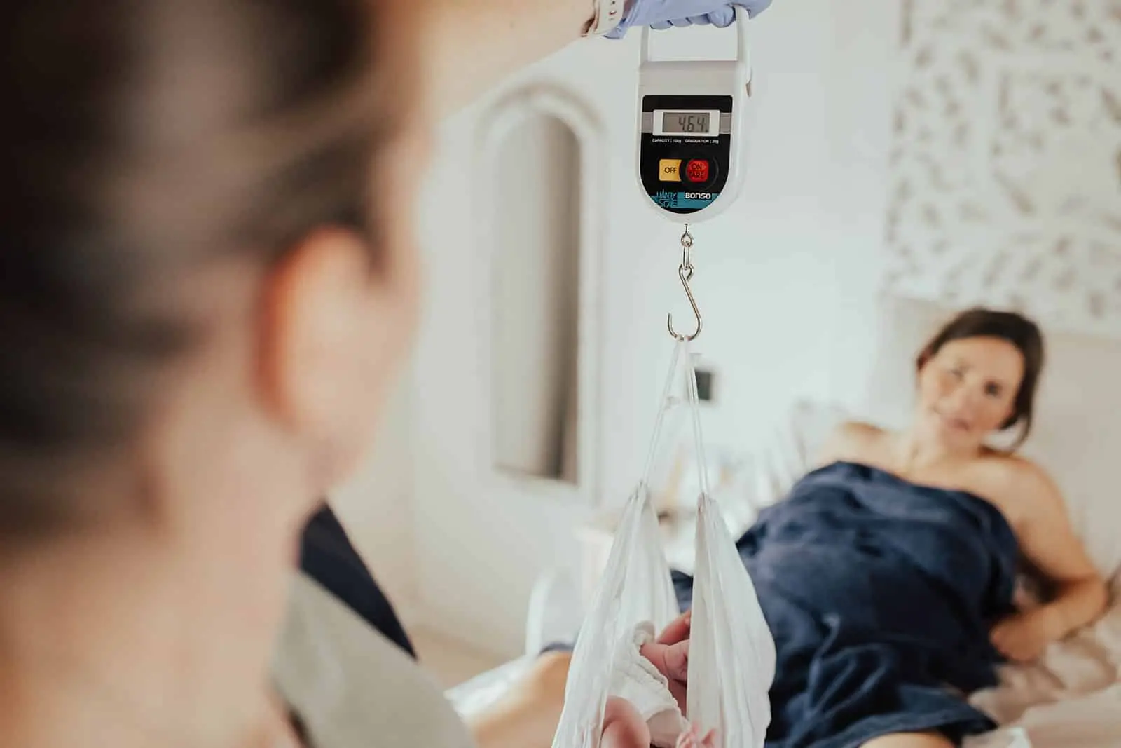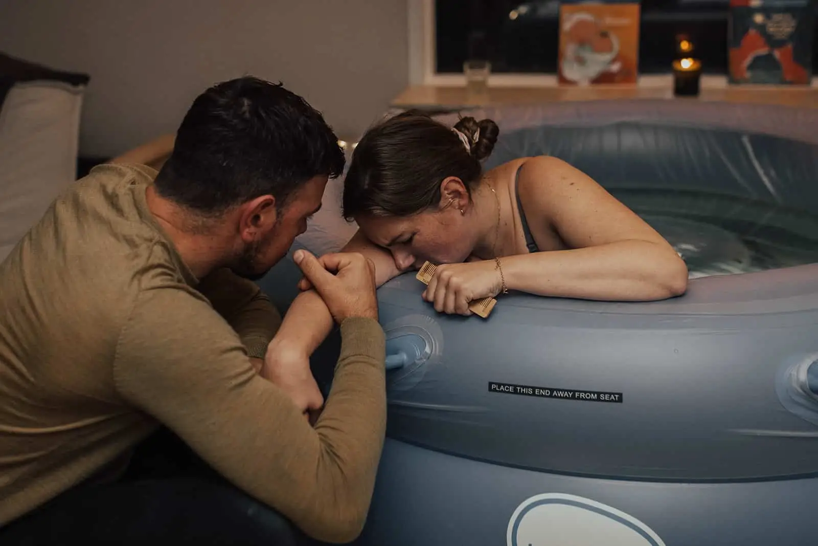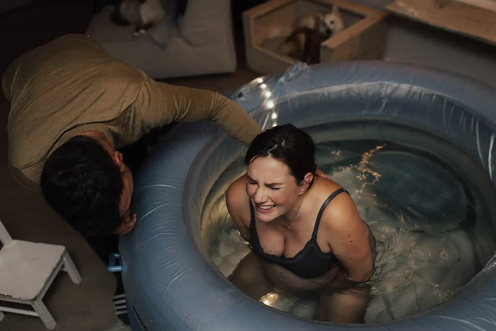 Toen de rust wederkeerde en ik even ruimte kreeg om alles in me op te nemen zag ik pas hoe gezellig en fijn de woonkamer was. Überhaupt het hele huis, prachtig! Op zo’n mooie rustige locatie met een enorme tuin en vrij uitzicht, ik begreep direct waarom ze hierheen verhuisd waren. De woonkamer was versierd met een slinger met daarop “hello baby”, er stond een heerlijke geurkaars naast het bad en fijne rustige muziek op. De lichten waren gedimd en er hing een lichtsnoer om het raam. Echt een ontzettend ontspannen en relaxte vibe heerste er en dat was ook alles wat deze geboorte was. De verloskundige, oma en ik zaten aan de eettafel en lieten Nayla (en Mark) even hun ding doen, weer in de bubbel komen en samen zijn. Af en toe keek ik om het hoekje en maakte ik een foto.