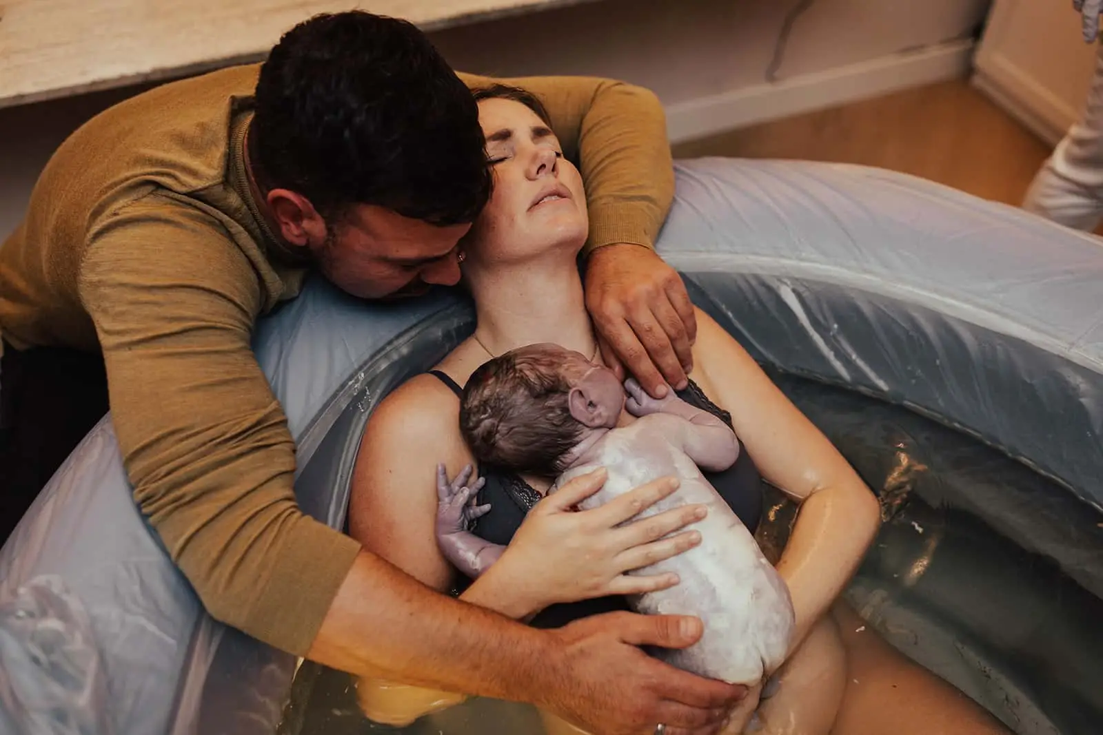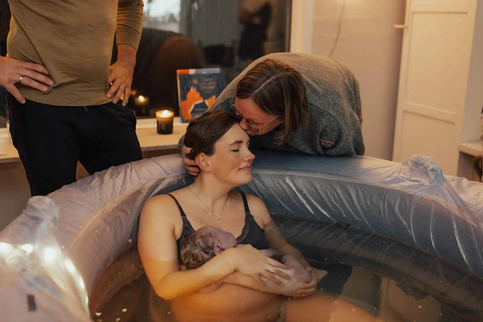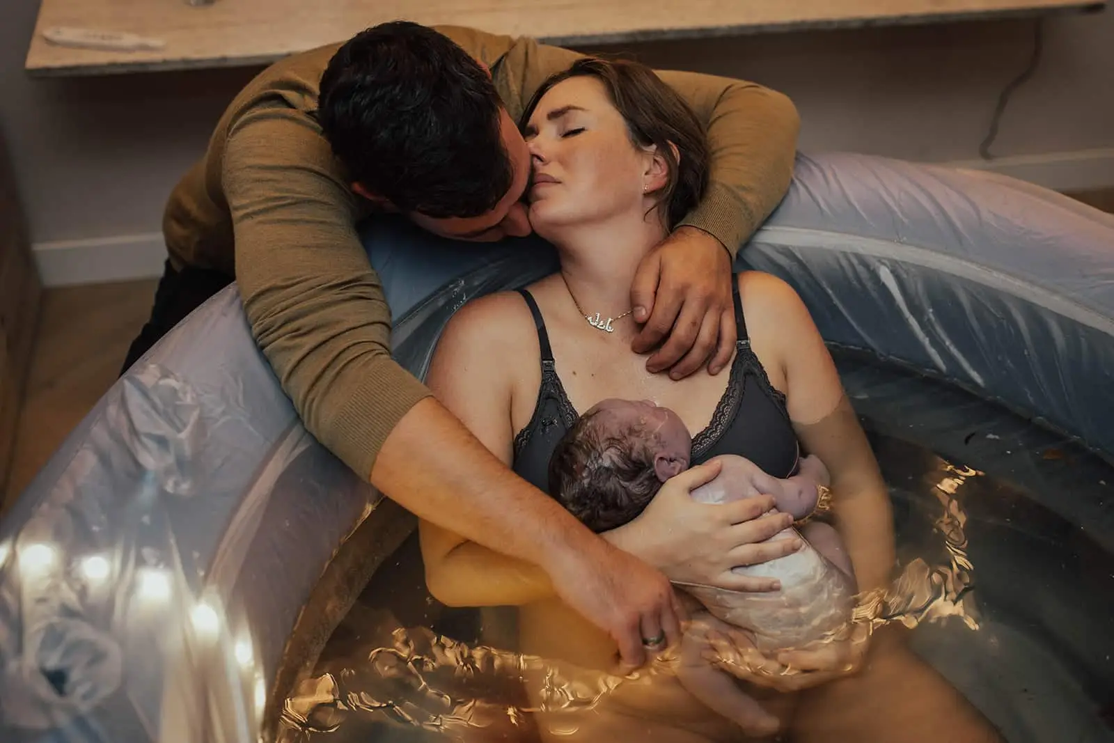 Rond 8 uur was het bad goed gevuld en op temperatuur en wilde Nayla erin. De weeën waren krachtig en het leek toch snel te gaan. Ik moet zeggen dat ik het zo ontzettend knap vond hoe ze die weeën opving én hoe kalm ze bleef. Echt een powervrouw! Hun kleintje werd geheel hands-off geboren in dit bad. Nayla pakte hem zelf aan terwijl ze letterlijk omarmt werd door Mark. Voor alle mannen die twijfelen of en hoe ze moeten steunen, er zijn, haar dragen, dat is alles wat je moet doen. En dat deed deze papa als een baas! Met hun kleintje in de armen omhelsde ze elkaar en zag je Nayla letterlijk weer landen. Naast mij stond een trotse verloskundige én een huilende oma. Naast het bad dook er een hondje omhoog om een kijkje te nemen bij het nieuwe leven. Echt, in een woord, prachtig.
